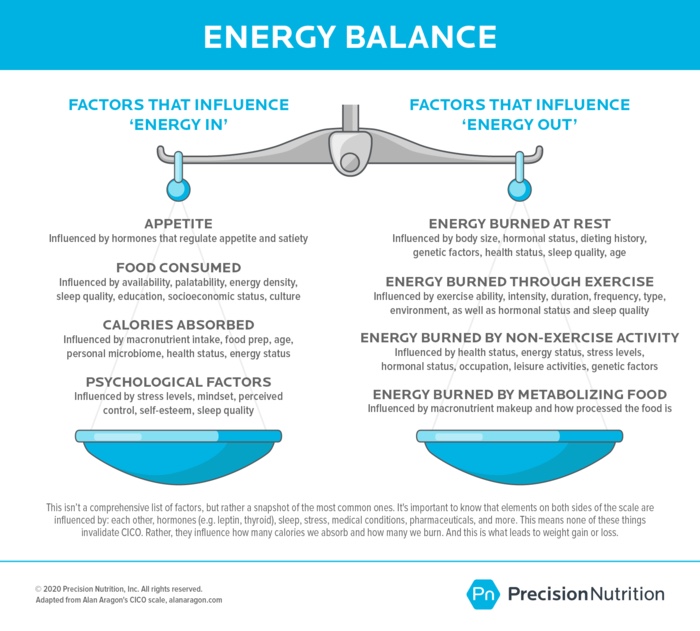 Principle #1: Weight loss and weight gain come down to one key equation. It’s all about the energy balance equation. In other words, Calories In, Calories Out (CICO). The basis comes from the law of thermodynamics. Energy can neither be created or destroyed, only transferred from one state to another.